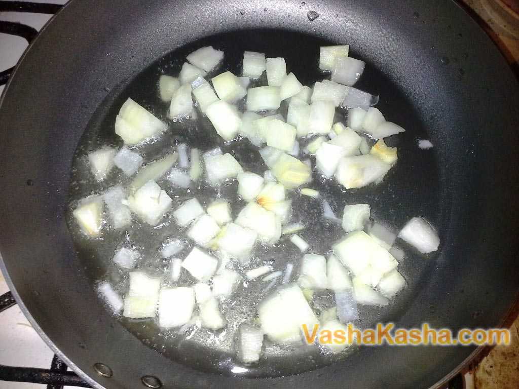 1. Очищаем луковицу, мелко нарезаем, отправляем жариться на сковороду с разогретым растительным маслом. Огонь оставляем небольшой, позволяя луку подольше пассероваться.