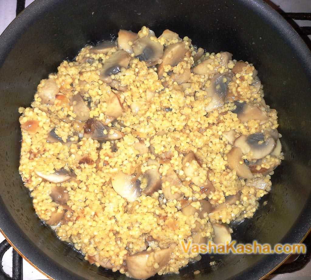 После этого в сковородку с грибами и луком необходимо добавить пшено вместе с водой, в которой оно было замочено.