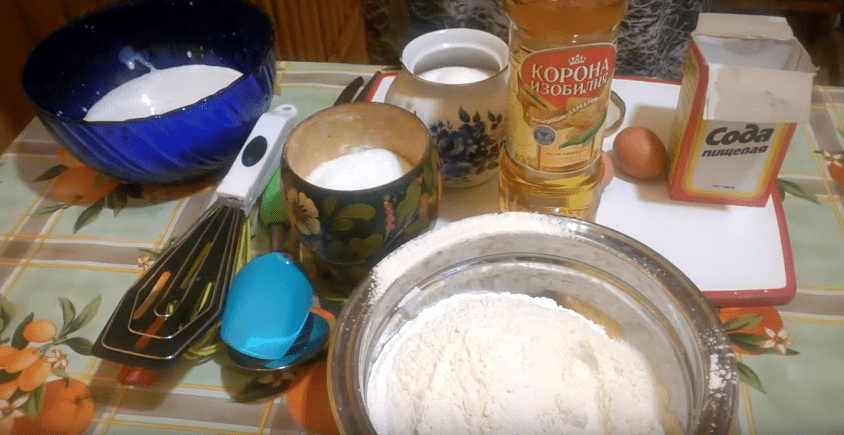 Для следующего варианта пышных оладушек на кефире понадобиться следующие ингредиенты: