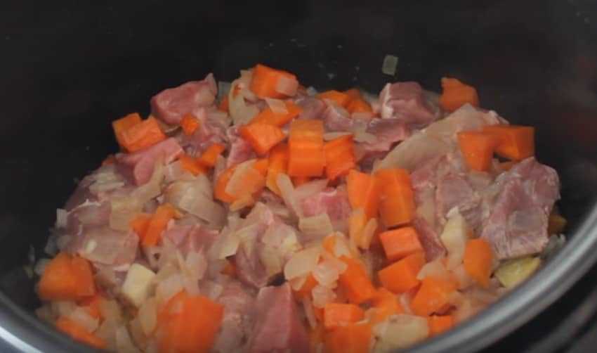 4. Морковь и лук выложите в чашу мультиварки, налейте туда подсолнечное масло. Включите режим «Жарка» на 10 минут. Потушите овощи несколько минут и добавьте мясо. Перемешайте все ингредиенты, закройте крышку и готовьте до окончания установленного срока программы.