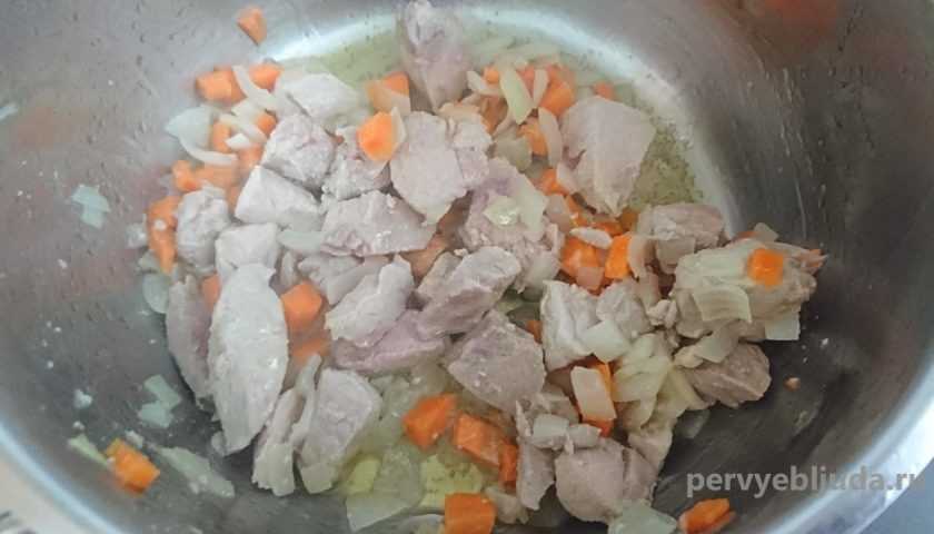 Мясо моем, режем на маленькие кусочки, величиной не боле 1×1 см. Кладем в кастрюлю к овощам. И немного обжариваем.