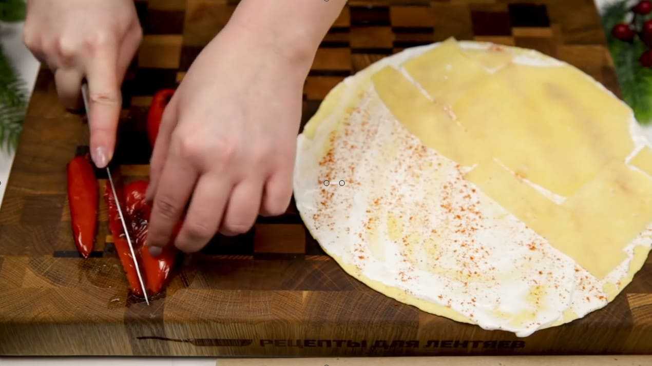- Когда будем заворачивать – перец окажется в самой середине и попадется в каждой части закуски. Но, это я уже забегаю вперед. Затем, плотно зажимаем пальцами лепешку и скручиваем все вместе, чтобы получился рулет.