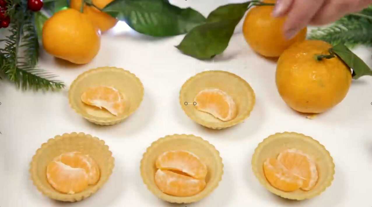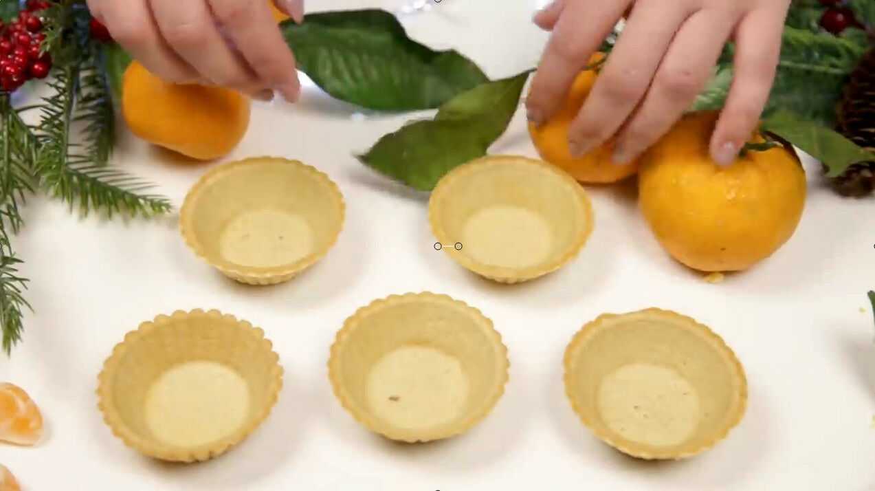 Для начинки очищаем один мандарин и разделяем его на дольки. По две штучки отправляем в каждую тарталетку.