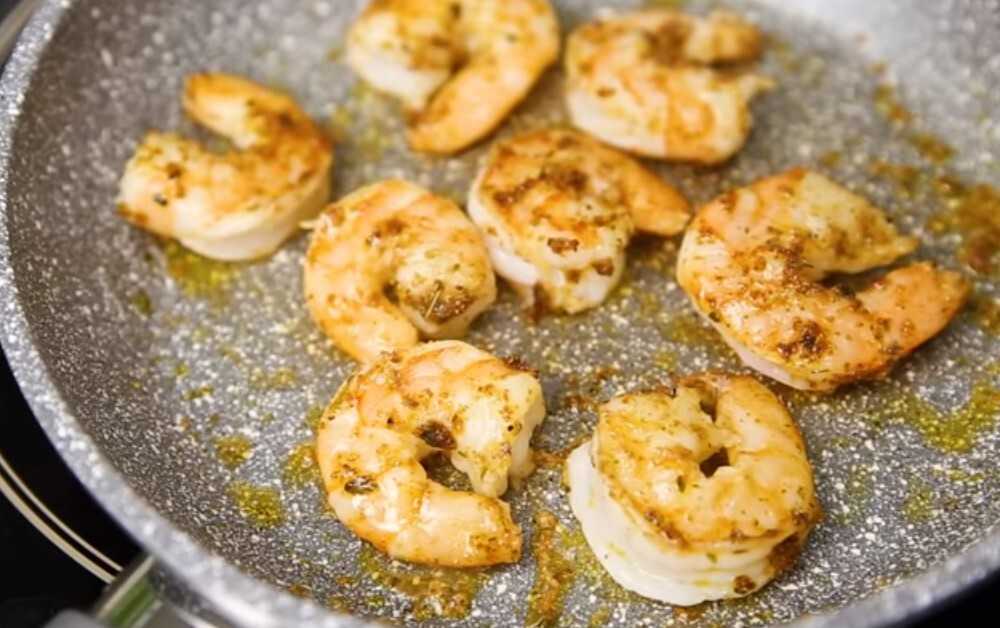 Очищаем креветки и удаляем из них пищевод. В сковороду наливаем немного растительного масла, добавляем специи и выкладываем морепродукты. Обжариваем с двух сторон, как только они начнут розоветь и преобладать по бокам золотистым оттенком, можно убирать.