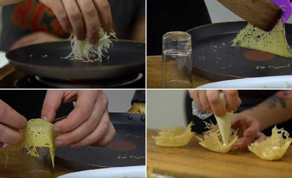 Неправильная форма круга с «рваными» краями будет выглядеть очень красиво. Когда сыр начнет плавиться и слегка подрумянится, отодвиньте сковороду с плиты и через некоторое время с помощью шпателя и вилки снимите его. Далее положите сырный круг на перевернутый стакан, рюмку, или маленькую мисочку и, пока он теплый, немного придавите руками, чтобы потом он сохранил именно такую форму при остывании.