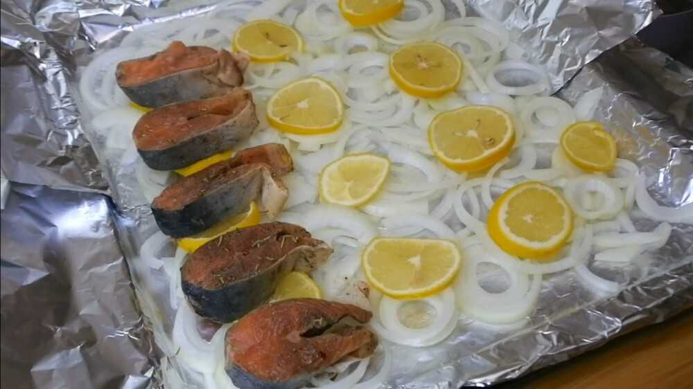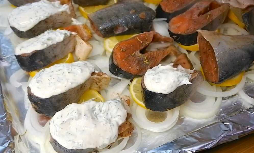 Горбуша, запеченная в чесночном соусе с луком и морковью