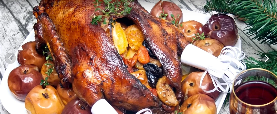 Запеченная утка, фаршированная яблоками и апельсинами в духовке