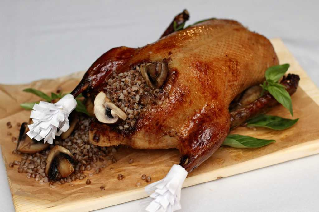 Утка рождественская, запеченная с гречкой и грибами в вине