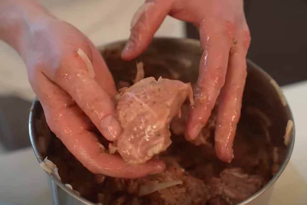 Перемешайте, чтобы мясо равномерно напиталось луковым соком и приправами. Маринуйте в течение 40 минут.