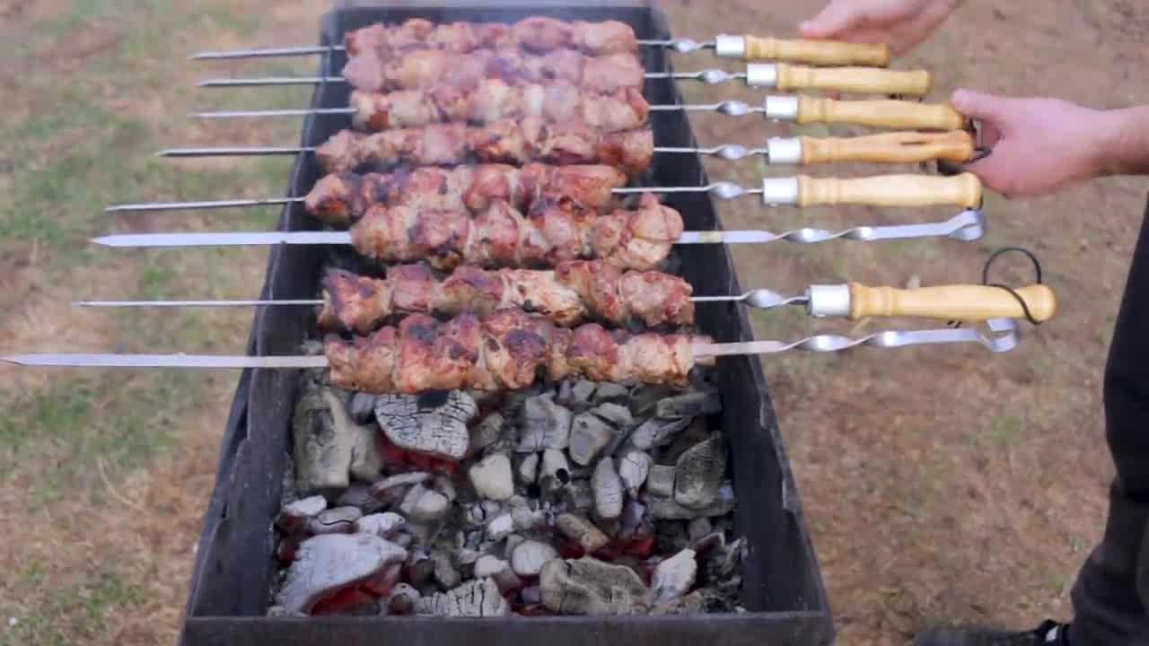 Не начинайте жарить ваш шашлык до тех пор, пока не погаснут все язычки открытого огня! В том случае, если пламя вспыхнет уже после того, как вы разместили шампуры с вашим шашлыком над углями, немедленно потушите его, сбрызнув небольшим количеством воды, вина или остатками маринада. Обжаривая ваш шашлык, старайтесь как можно более равномерно и регулярно поворачивать шампуры с кусочками мяса над углями. Универсального совета, сколько жарить шашлык не существует. Все зависит от мяса, от формы, от углей и расстояния от углей до мяса.