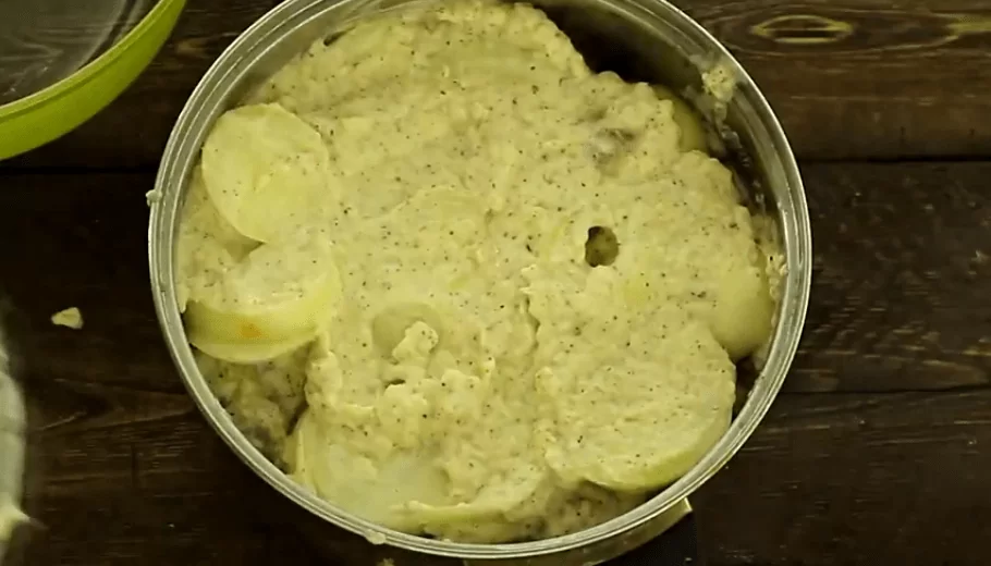 - Свинину очищаем от пленок и нарезаем. Лук чистим, режем, мнем до появления сока. В глубокую посуду помещаем слой мяса, присыпаем специями. Кладем первый луковый слой, смазываем майонезом. Так чередуем, пока не выложим все продукты.