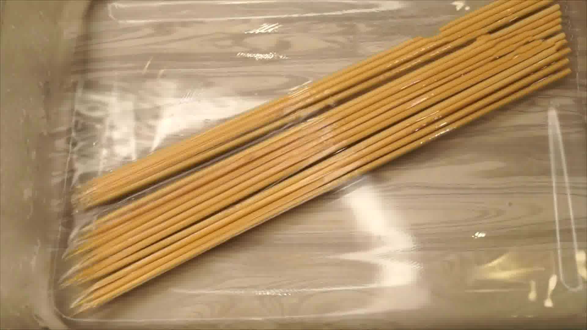 Необходимо залить шпажки кипятком на 15 минут, чтобы они не горели в духовке.