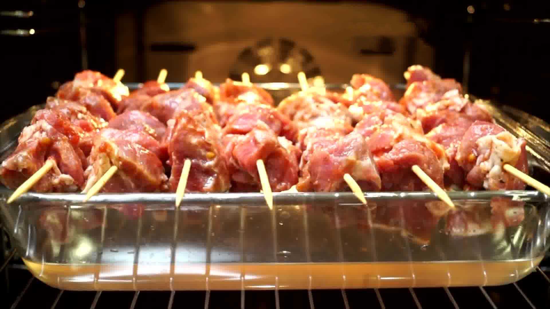 Шпажки должны лежать на краях противня, как будто на мангале. На дно противня наливаем воду тонким слоем, чтобы сок, капающий с мяса, не пригорел ко дну.