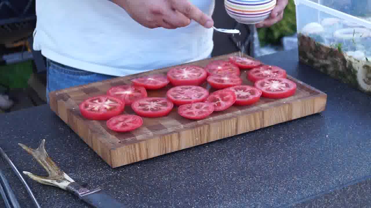 Пока мясо пропитывается, подготавливаем мангал и нарезаем помидоры на крупные кольца. Помидоры слегка присаливаем.
