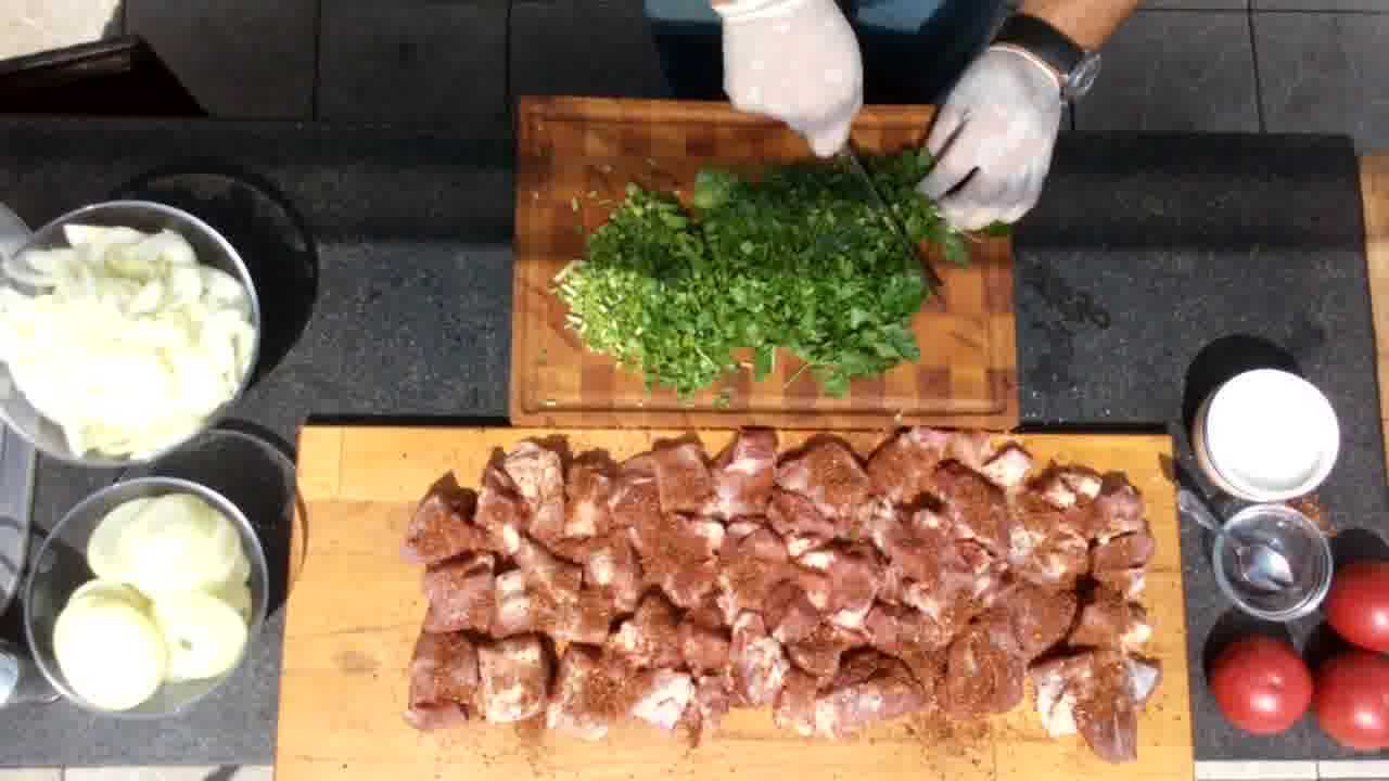 1. Все что нужно сделать, это нарезать мясо на куски, а лук- тонкими колечками. Соединить мясо и лук в одной миске, добавить соль и специи и хорошенько все перемешать.