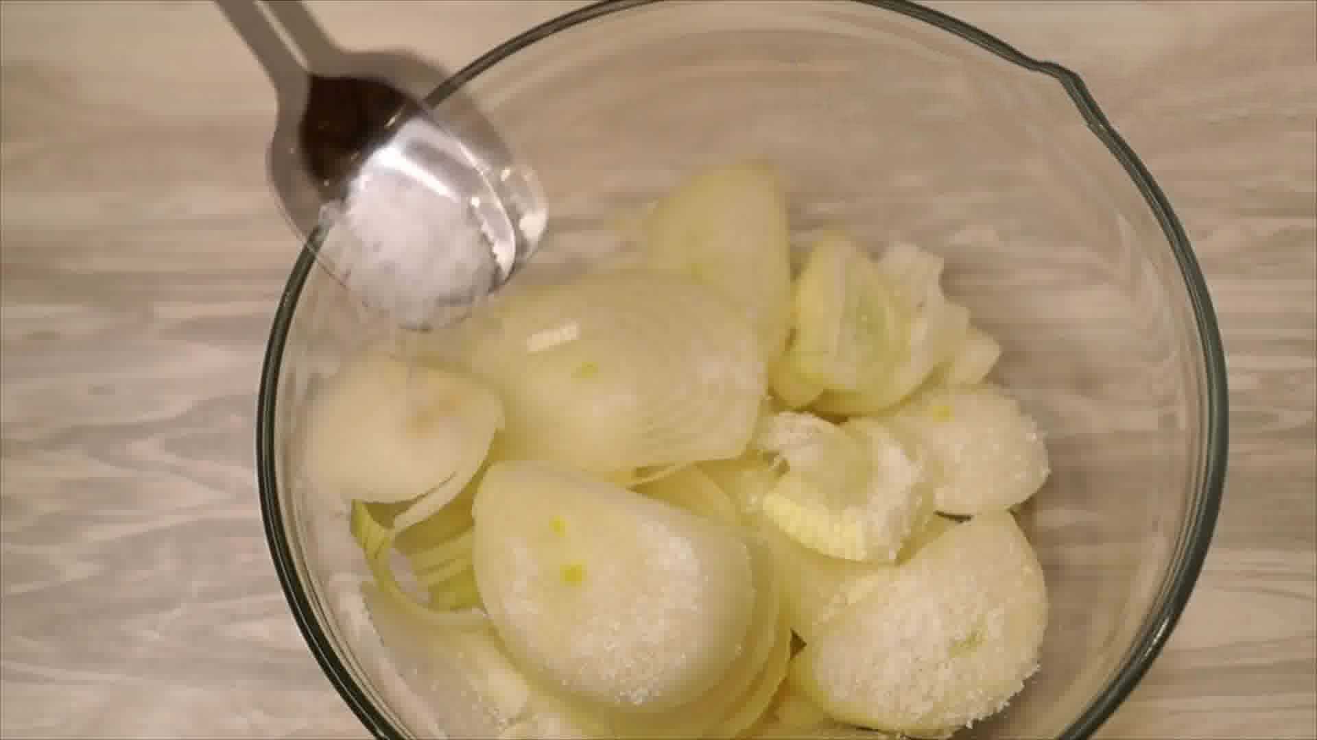 Шаг 1. Нарежьте лук кольцами, ( небольшое количество отложите в сторону), добавьте соль, затем тщательно отожмите его, чтобы получить сок.