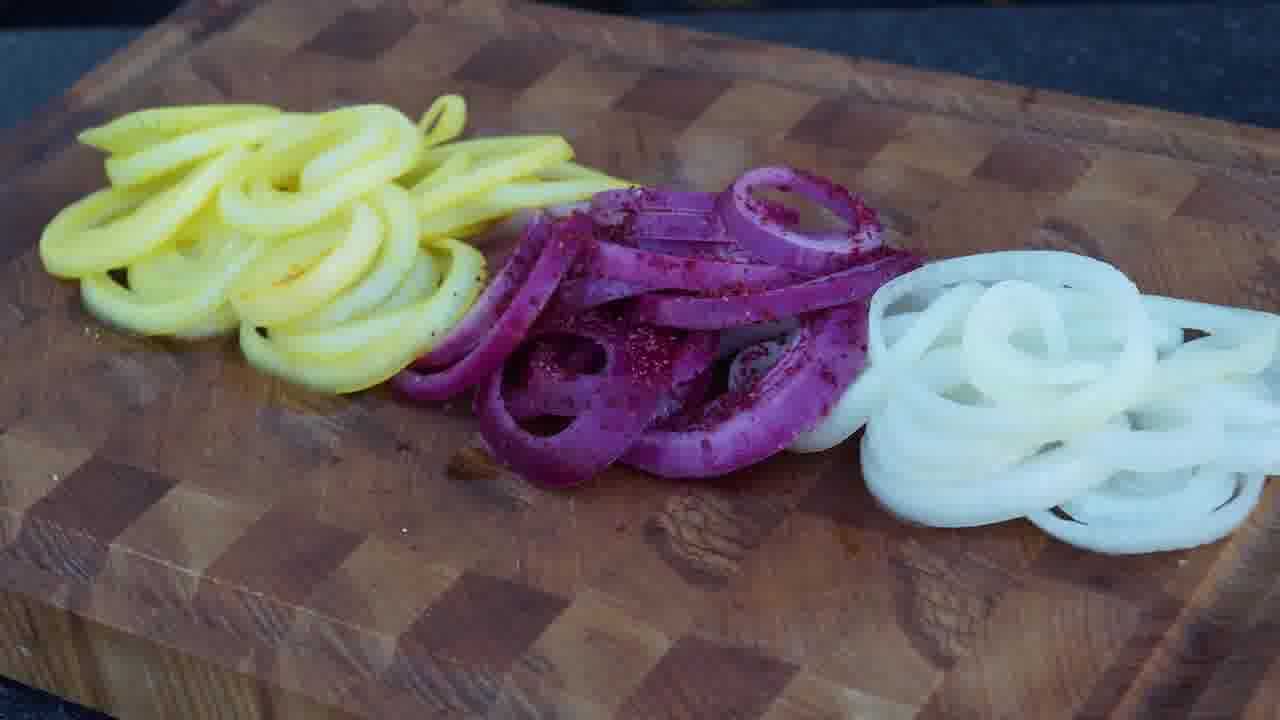 Сначала очистим лук и нарежем на полукольца, но не весь. Три луковицы нарезаем отдельно крупными кольцами. Его будем использовать для украшения шампуров.