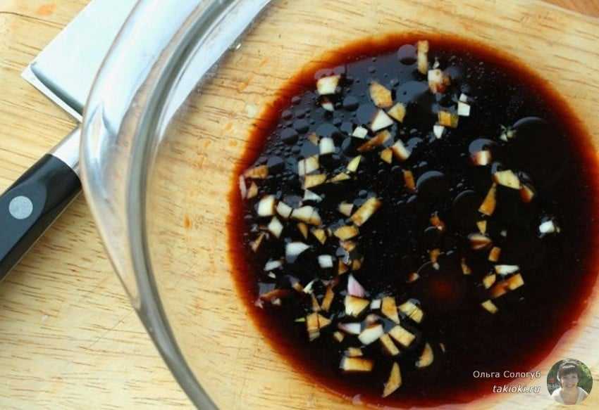- Сделайте маринад, смешав в мисочке соевый соус, мед, ложечку горчицы. Разотрите смесь.