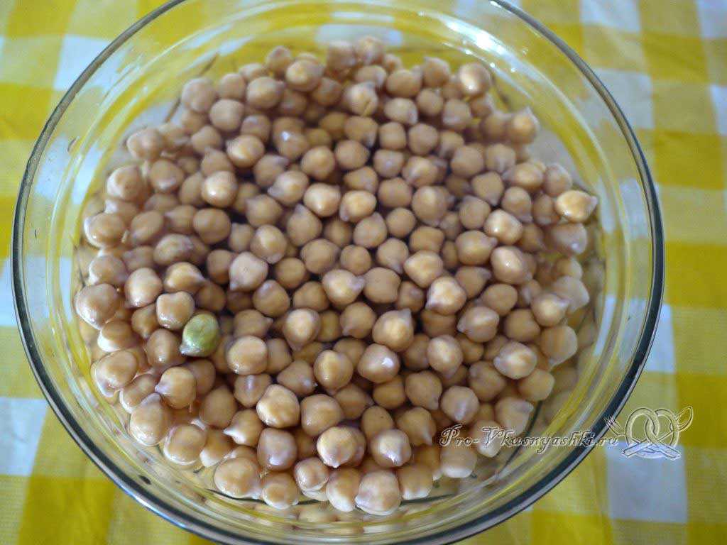 Сначала нужно замочить нут в воде на ночь (или на 8 часов), добавив чайную ложку пищевой соды. Вода должна покрывать сухой горох в два раза. Когда нут разбухнет, слить воду и промыть его используя дуршлаг.
