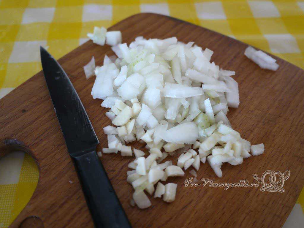 Репчатый лук (1 шт) и чеснок (2-3 зубчика) нарезаем мелким кубиком.