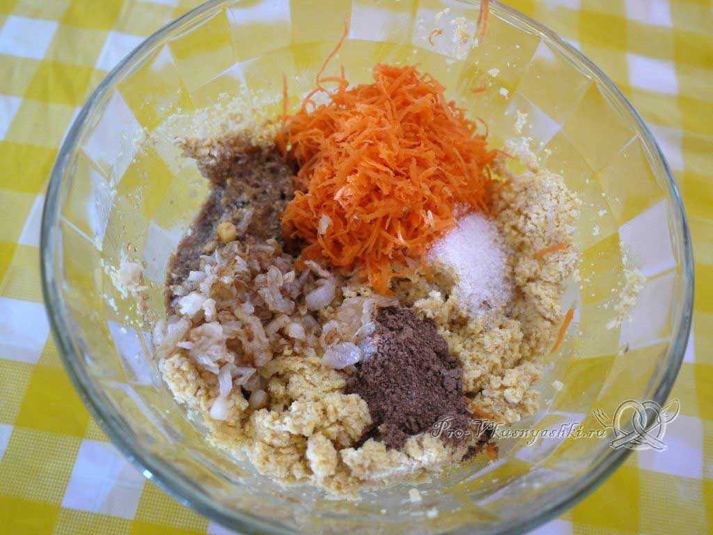 Добавляем к измельченному нуту обжаренные овощи, морковь, мускатный орех (1 ч.л), соевый соус (3 ст.л), лимонный сок (2 ст.л) и сахар (1 ч.л).