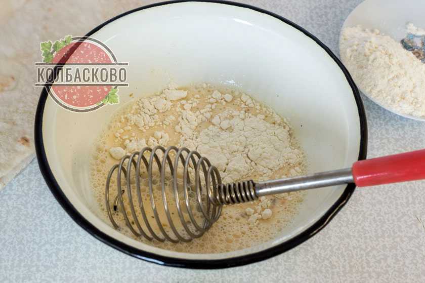 2. Размешиваем все ингредиенты венчиком до однородности и растворения соли. Начинаем всыпать постепенно муку, добавляя по одной столовой ложке.