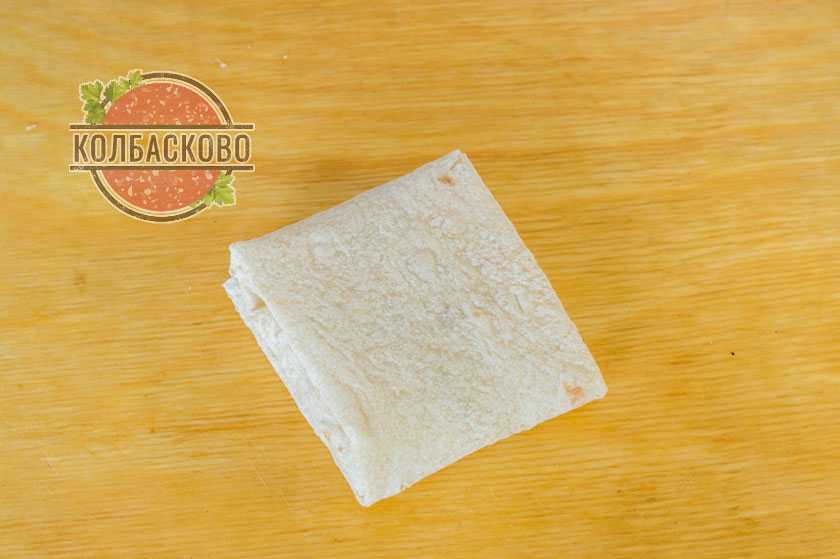 - Берем 1 тонкий лаваш и складываем его пополам, а затем еще раз пополам. Разрезаем лаваш таким образом, чтобы получилось 4 одинаковых листа.