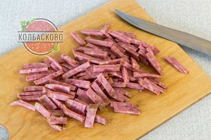 - Берем 245 г любой колбасы и нарезаем ее мелкими кубиками. Я предпочитаю копченую колбасу, но вы можете использовать любую. Также для начинки подойдет ветчина, куриное филе, крабовые палочки, сосиски и многое другое.
