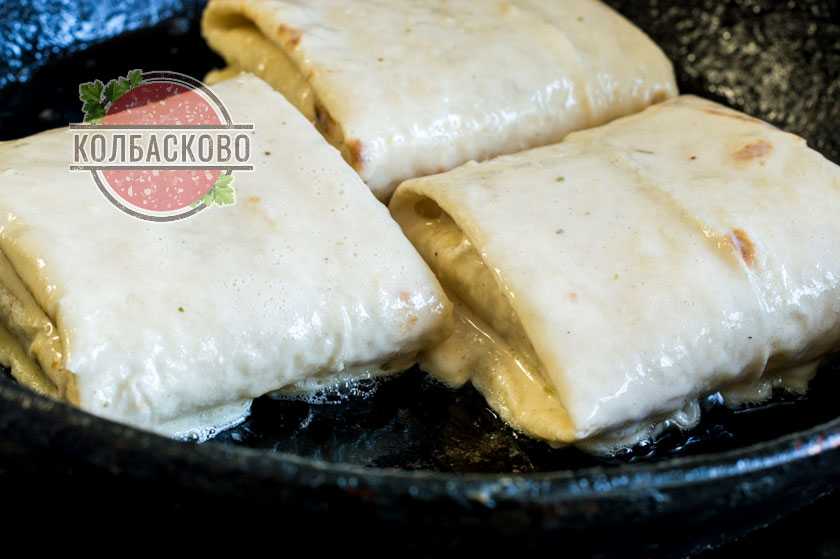 12. Выкладываем лаваш в кляре с начинкой на раскаленную сковороду с растительным маслом швом вниз. Обжариваем минуты три на среднем огне.