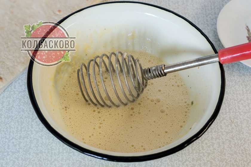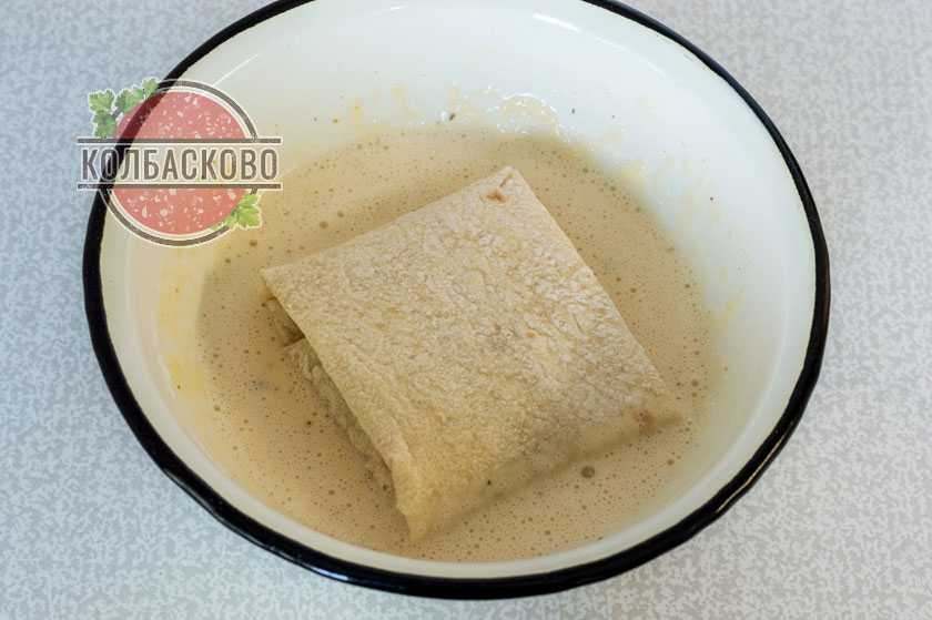 - Каждый кусочек лаваша с начинкой обмакиваем с двух сторон в яичную массу и отправляем на сковороду.