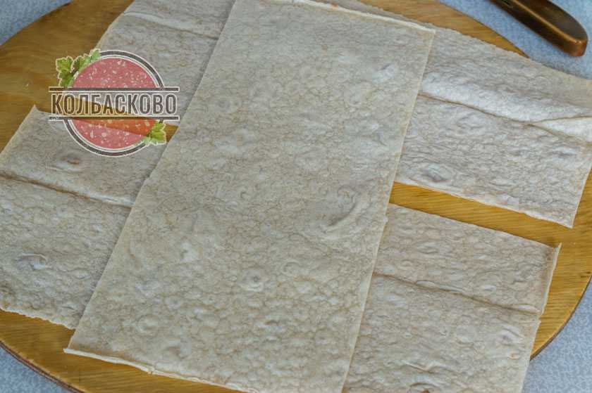 6. Лаваш нарезаем на прямоугольные полоски. В данном случае был один очень большой лаваш весом 230 граммов. При разрезании из него получилось 7 прямоугольников размером 13 х 30 см.