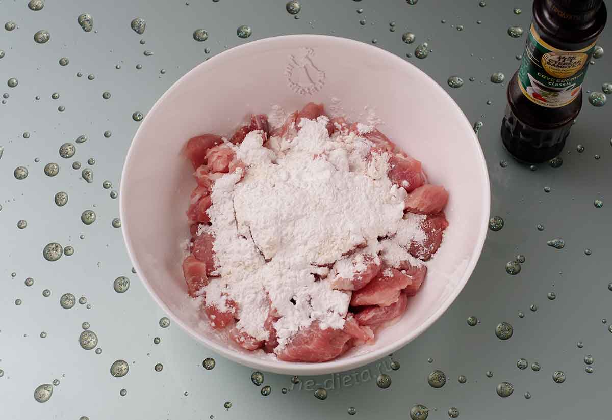 Сперва необходимо порезать мякоть свинины маленькими кусками – так, чтоб было комфортно брать палочками либо вилкой. Насыпаем прямо к мясу кукурузный крахмал.
