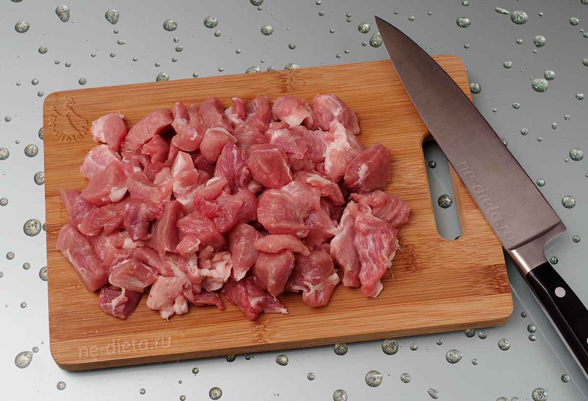 Мясо промойте под струей воды и нарежьте на небольшие кусочки. Перед тем как начать готовить, свинину поперчите, посолите и уберите на ночь в холодильник. Если не хочется так долго ждать, то хотя бы на 2 часа.