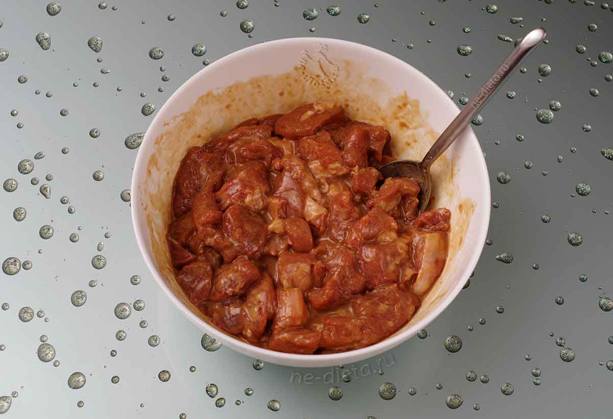 - Соевый развести с водой и заправить им мясо. Поставить на час холодильник.