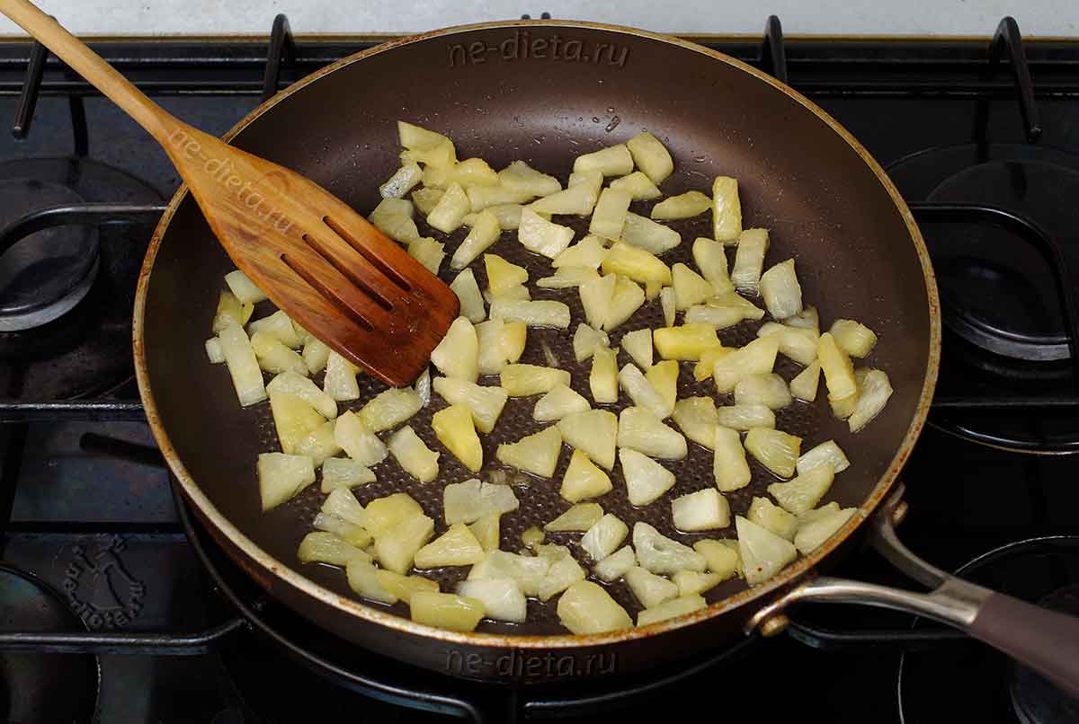 - Потом добавляются ананасы, поджариваются и все убирается со сковороды в отдельную миску.