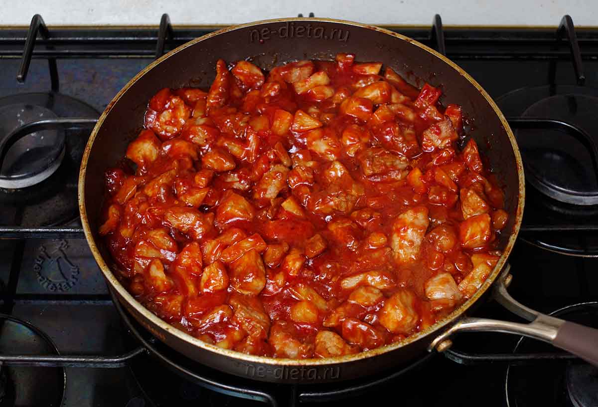 Прогреваем содержимое сковороды на среднем огне, помешивая, до кипения. Кипятим несколько минут, опосля чего же выкладываем в соус обжаренные куски мяса.