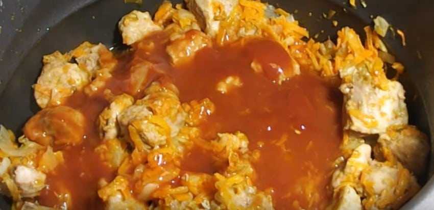 2. Овощи обжариваем и тушим минут 7-10, затем добавляем к ним томатную пасту, 1 ст. ложку воды и еще готовим минуты 3.
