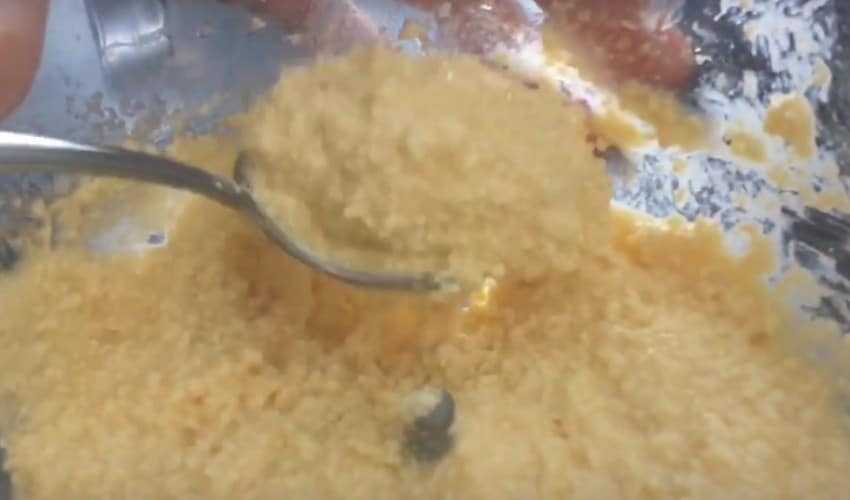 - Добавить яйца и снова растереть, на этот раз просто ложкой.