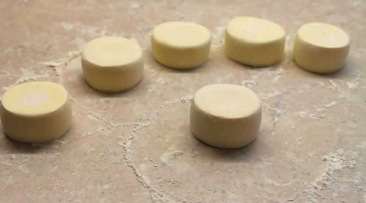 - Рабочий стол и нож посыпаем мукой. Руками делаем круглые изделия. При помощи ножа придаем им нужную форму. Разогреваем сковороду и наливаем туда немного растительного масла. Обжариваем заготовки на умеренном огне с двух сторон до румяной корочки.