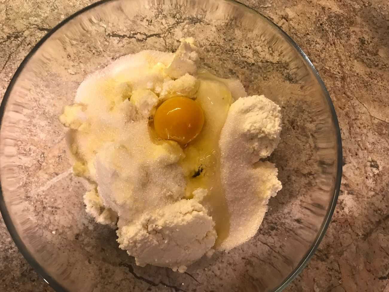 - Творог отправляем в миску, разбиваем яйцо. Затем добавляем сахар, соль, ваниль и манку.