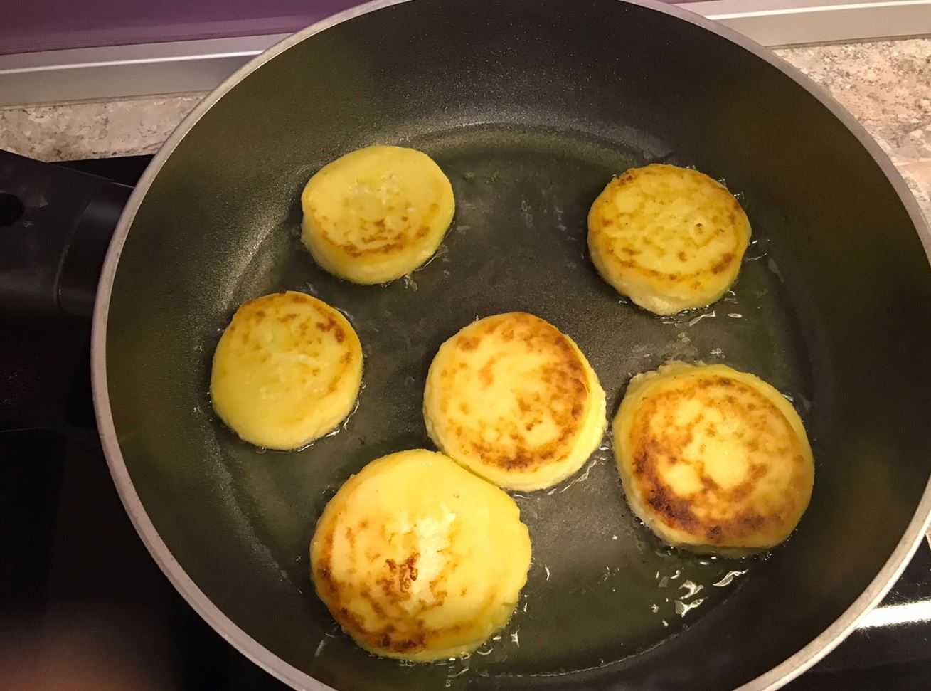 - Выложить все сырнички на ее поверхность и жарить 3-4 мин с каждой стороны.
