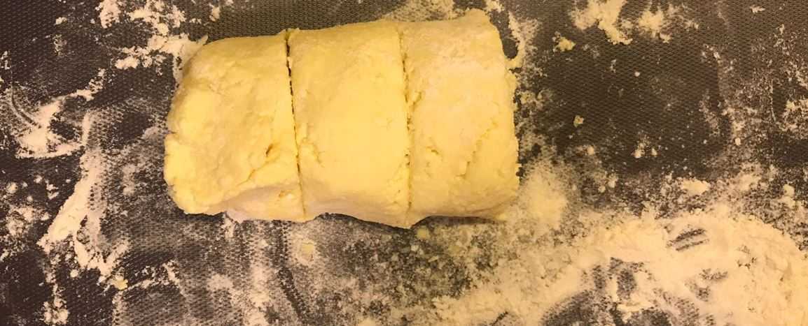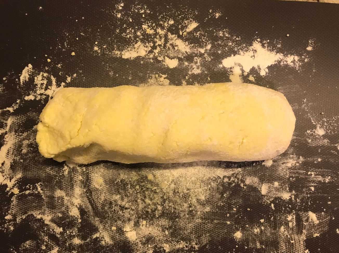 На чистую и сухую столешницу или разделочную доску насыпьте немного муки и выложите на нее приготовленную массу. Теперь нужно скатать рулетик в форме толстенькой колбаски. По мере необходимости добавляйте муку, только сильно не увлекайтесь ею.