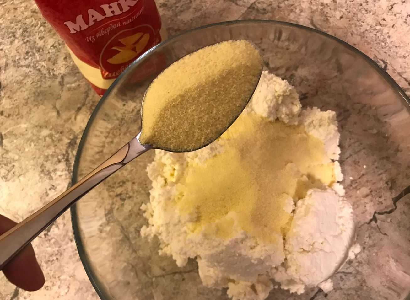 1. В миске для замешивания разминаем творог, солим по вкусу и добавляем полторы ложки сахара. Количество зависит от того насколько кислый творог у вас. Дальше разбиваем одно куриное яйцо и подсыпаем манки.