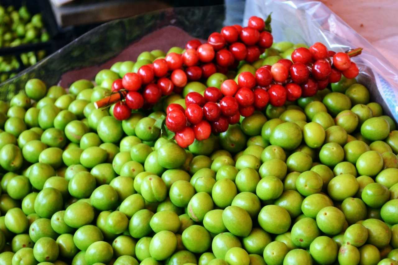 То есть реально 2 цвета, а готовят 3 вида ткемали по цвету. Зеленый ткемали готовят весной из еще зеленых слив. На фото настоящая слива ткемали (зеленая и не спелая) с веточкой черешни на грузинском рынке.
