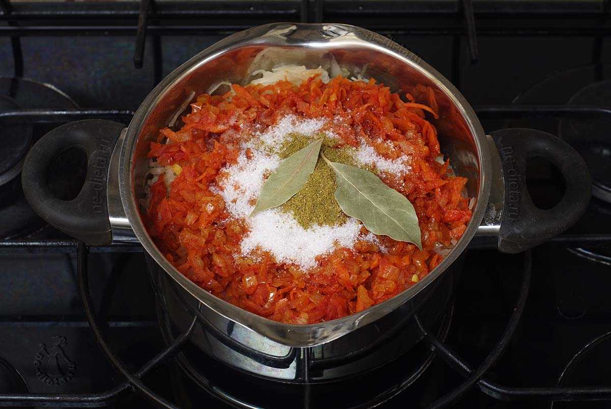 Добавить томатную пасту, тщательно перемешать и готовить еще 5 минут. Овощная зажарка для тушеной квашеной капусты готова!
