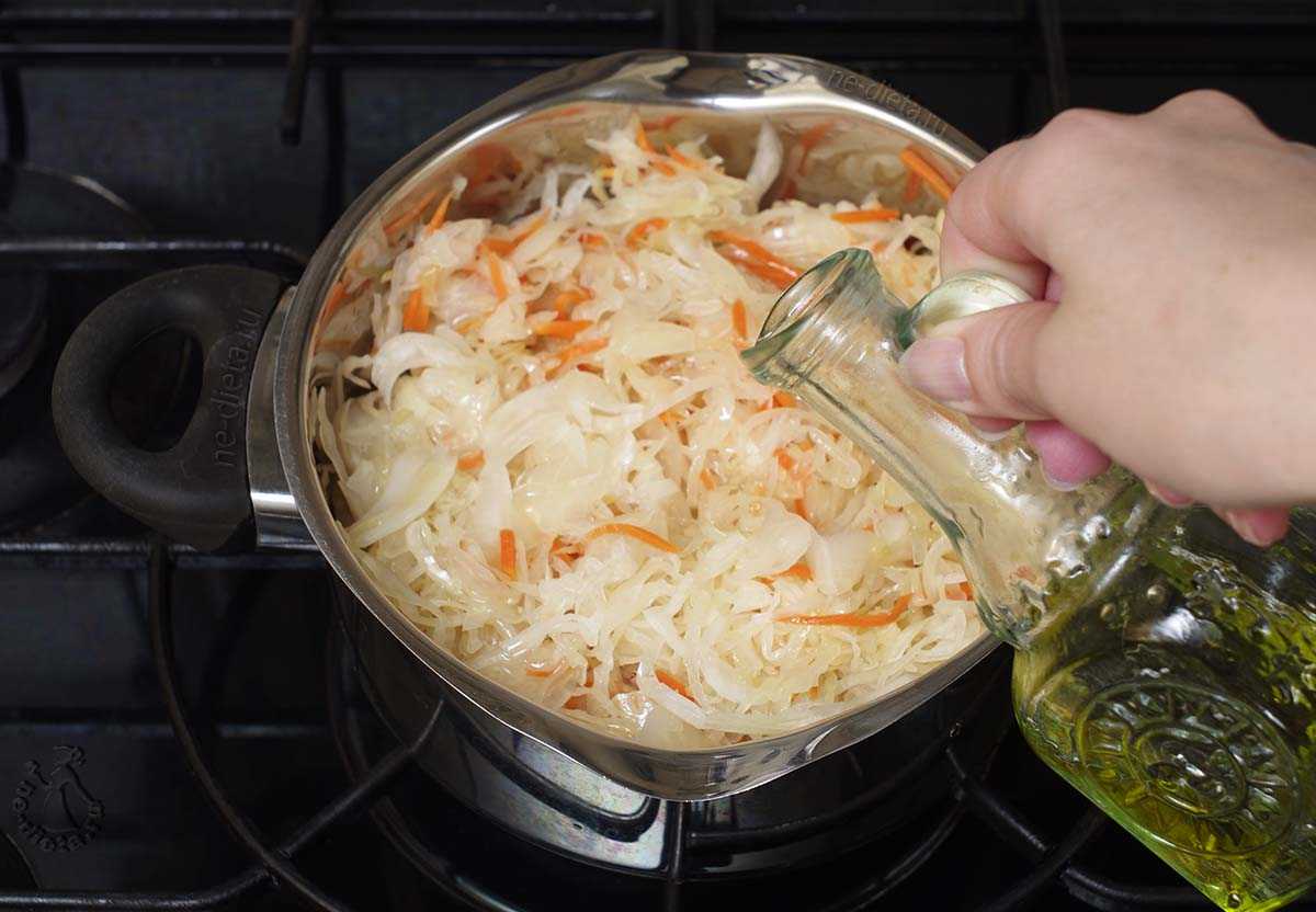Лук и морковь обжариваются поочерёдно на разогретом масле, после к ним добавляется квашеная капуста. Затем нужно добавить к овощам воду – около 100 мл. Тушить до полного приготовления, добавив в конце тмин и приправы.