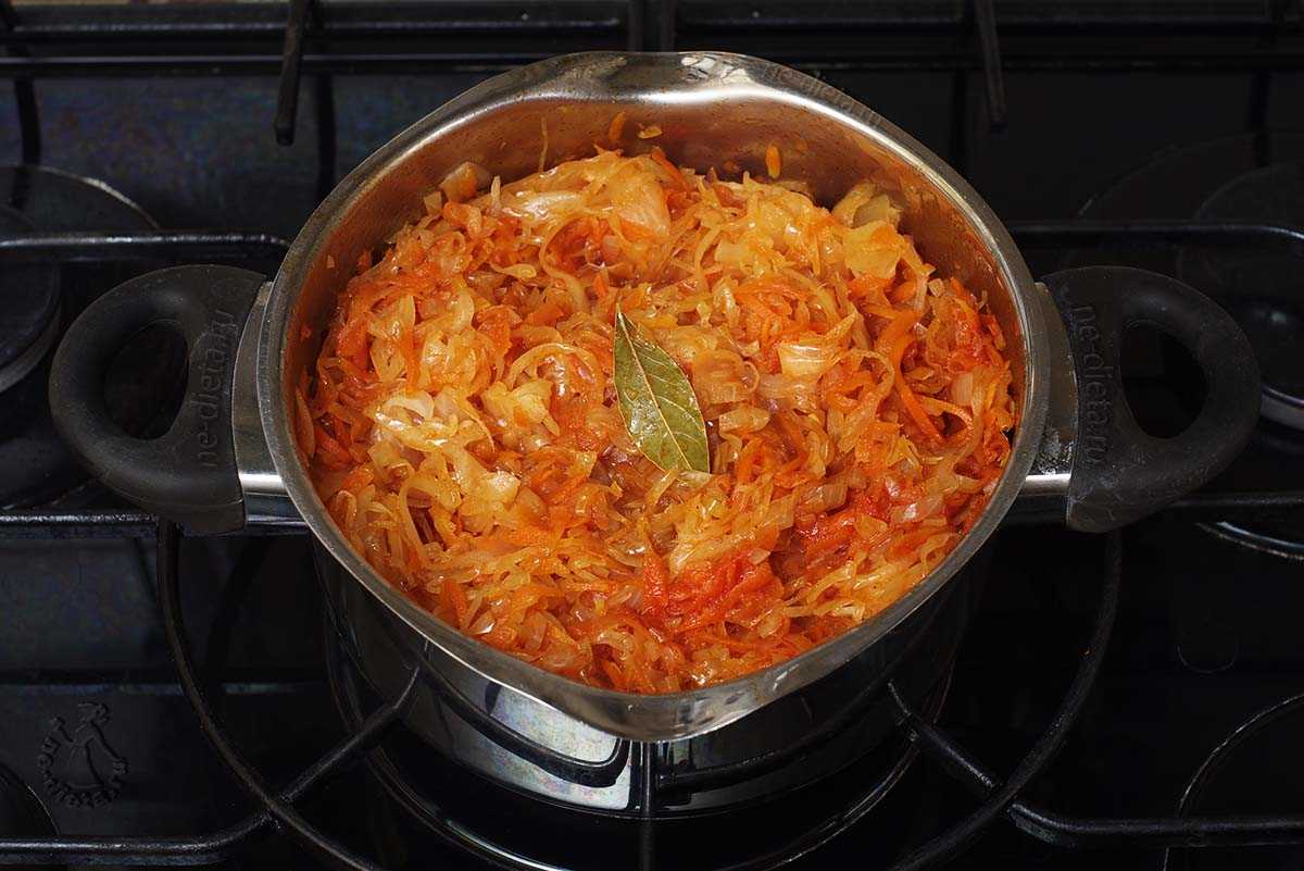 Тушить кислую капусту с овощами и томатной пастой на маленьком огне под крышкой в течение 30 минут. Ближе к концу приготовления следует пару раз перемешать блюдо, иначе оно может начать подгорать.