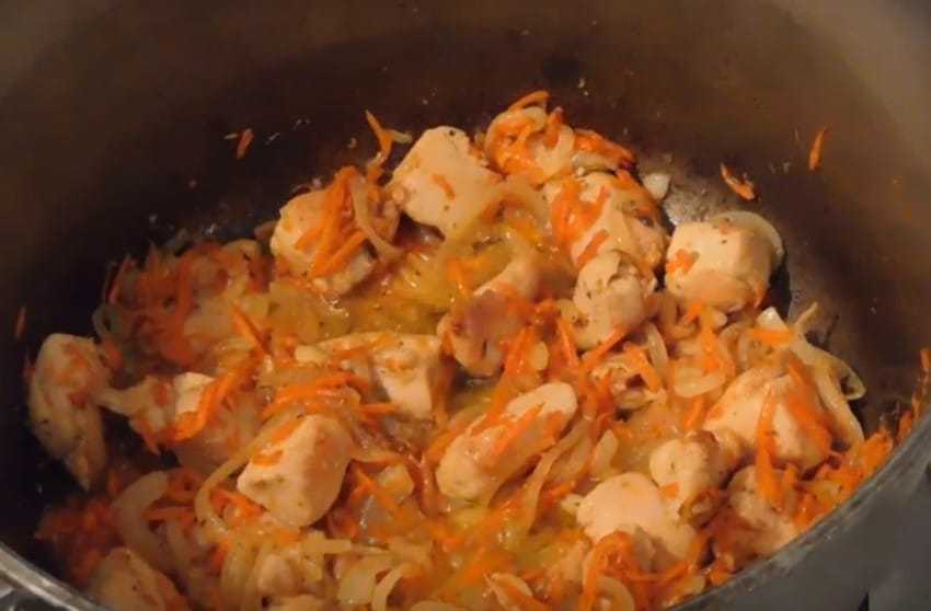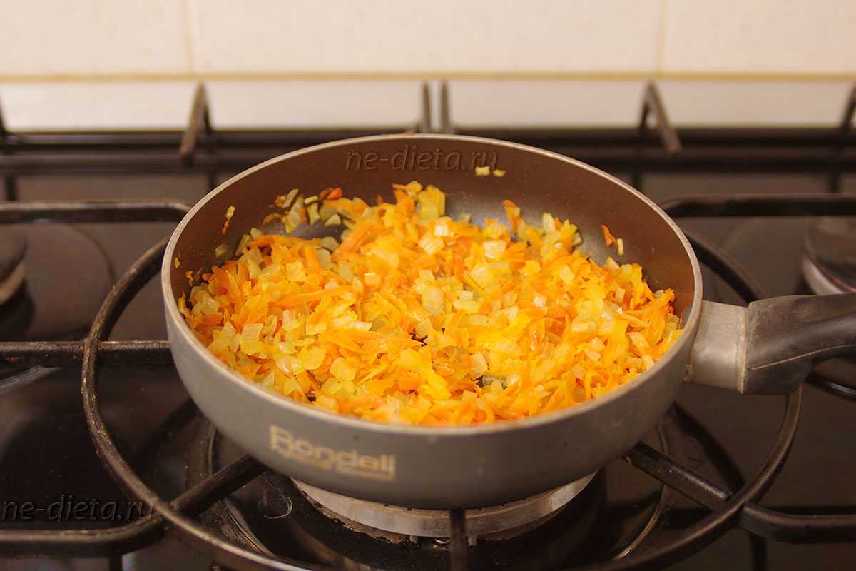 На сковороде разогреть 2 ст. л. растительного масла, выложить лук с морковью и обжарить овощи на среднем огне в течение 5 — 7 минут.