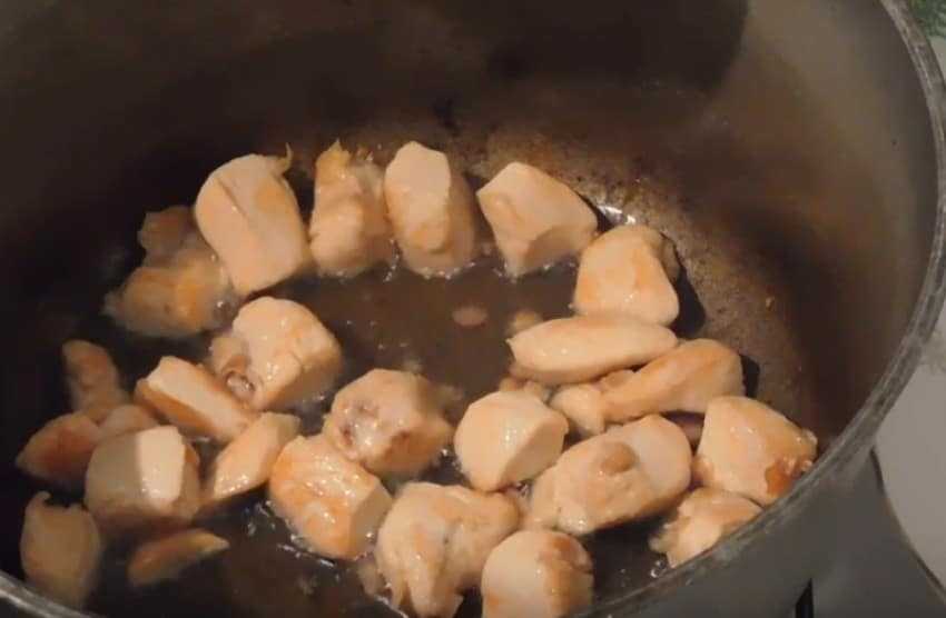 Мясо следует порезать крупными или мелкими кусочками (по желанию) и обжарить на разогретом подсолнечном масле до белого цвета. После добавляется нашинкованная капуста, всё перемешивается и готовится в течение 15 минут.