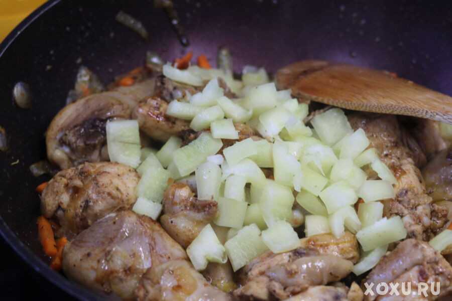 - Воду мы в казан не добавляем, все будет готовиться в собственном соку.
